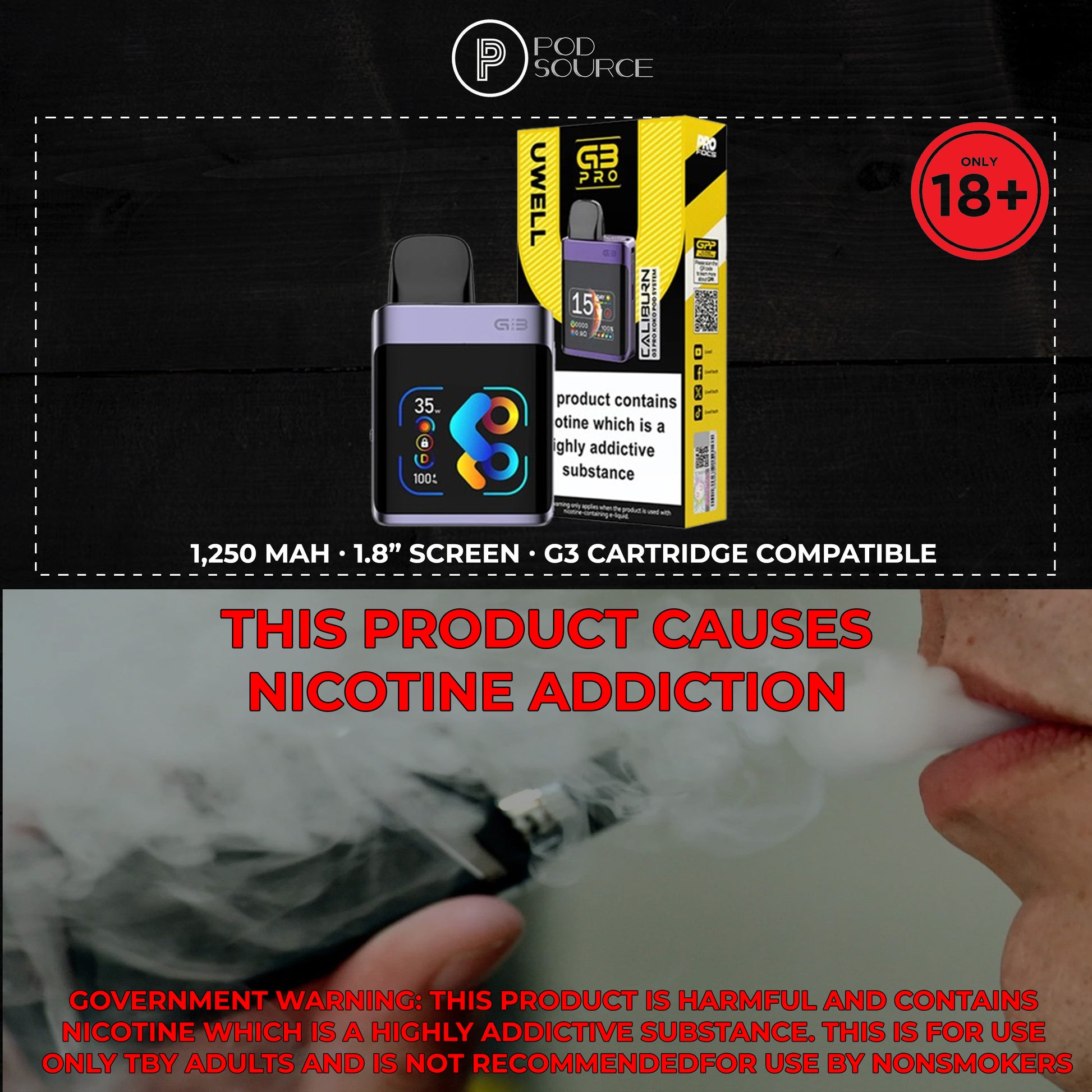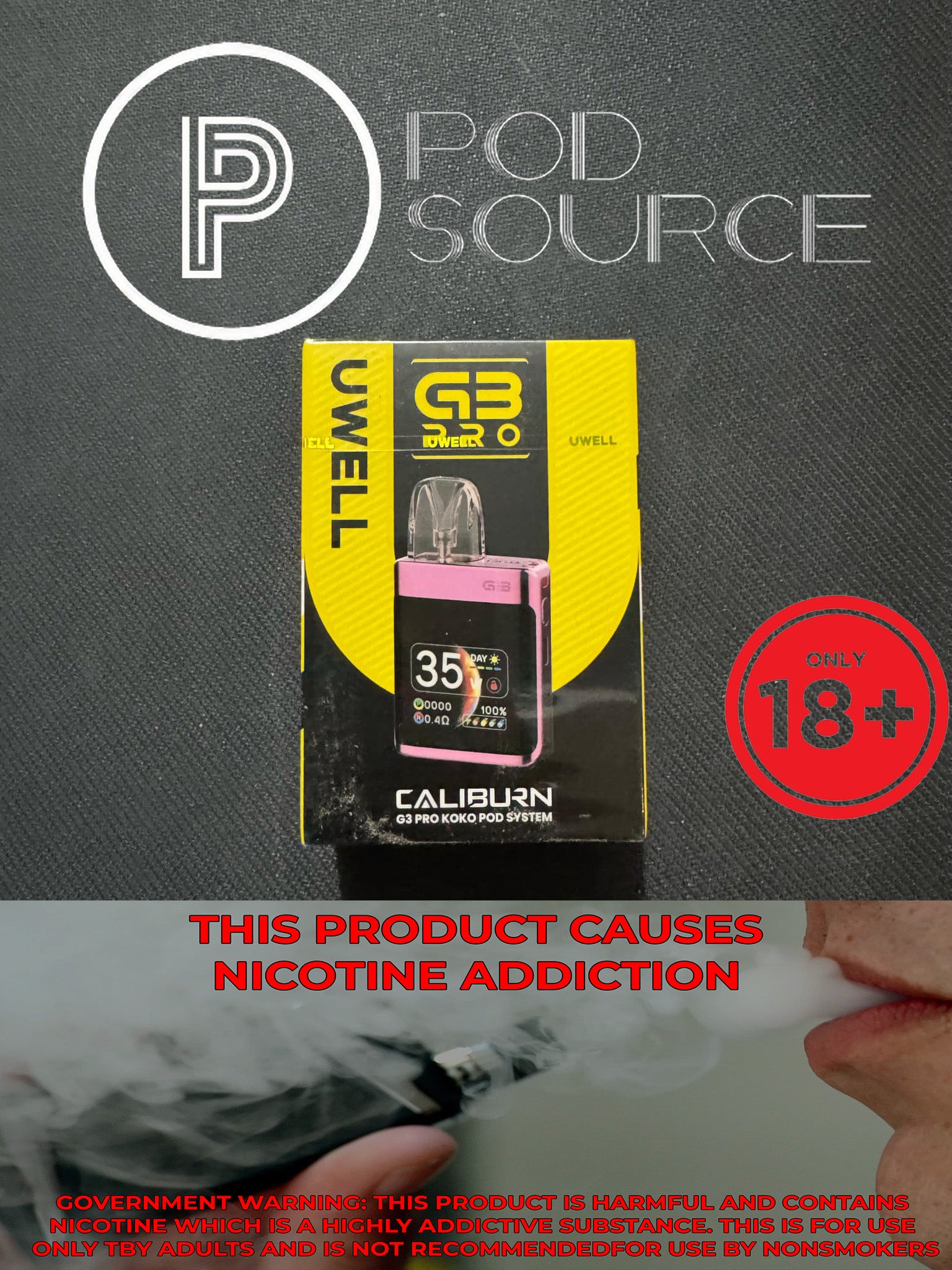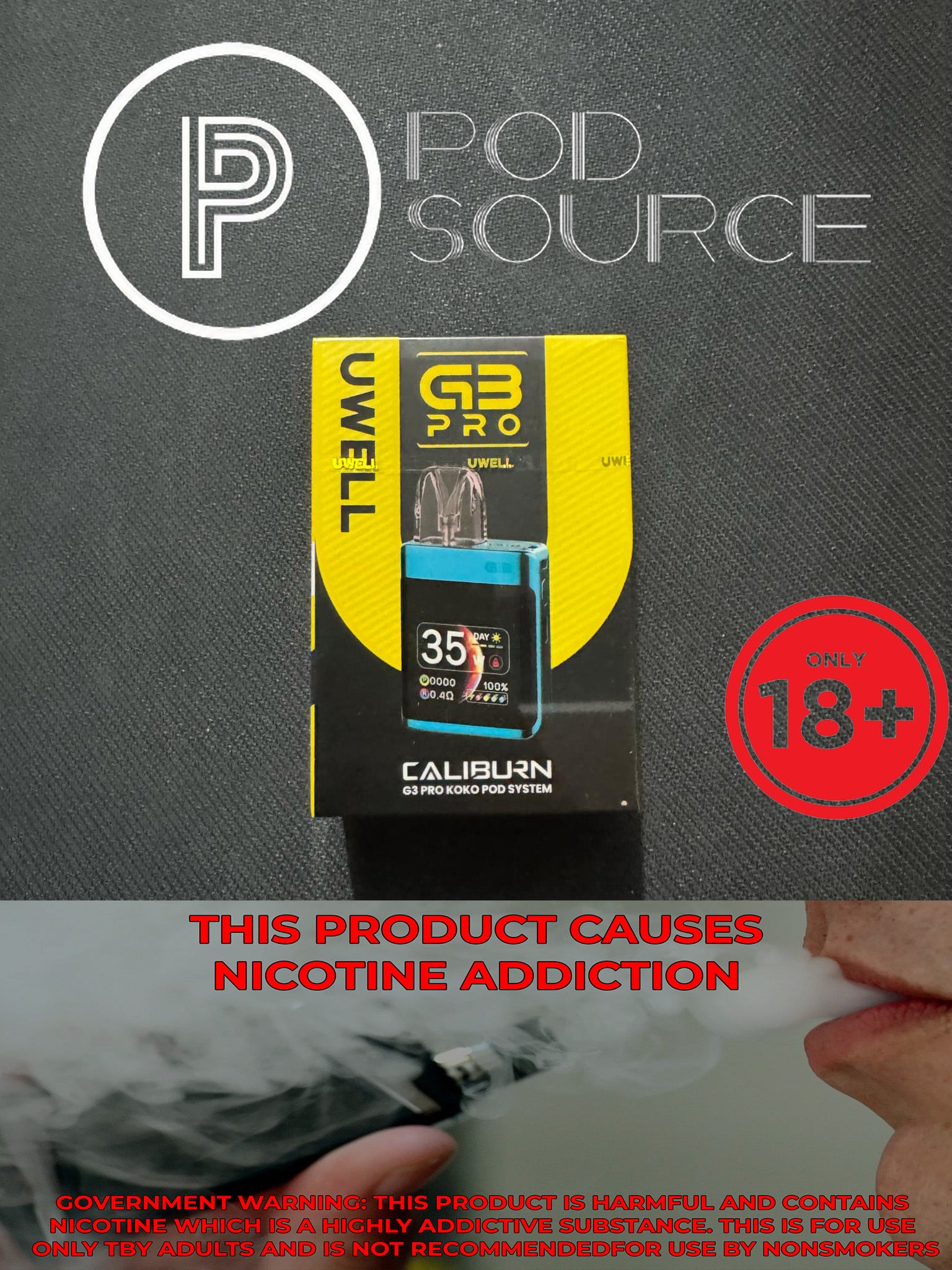 Uwell Caliburn G3 Pro KOKO Pod System, featuring a 1250mAh battery, 35W output maximum, adjustable airflow control, and delivers exceptional flavor from the Caliburn G3 Pods. Constructed from durable zinc-alloy, the chassis of the Caliburn G3 Pro KOKO is lightweight and portable, fitting neatly into the pocket, purse, or bookbag. Offering a restricted direct lung vaping style, the Caliburn G3 Pro KOKO is the next evolution of the legendary Caliburn line.